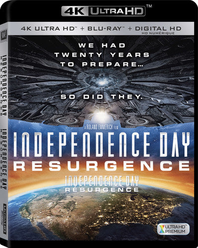 Jeff Goldblum, Liam Hemsworth, Bill Pullman. In the aftermath of the original alien invasion, the nations of Earth rely on a complex defense system engineered from recovered alien technology. But when aliens arrive with a fleet that dwarfs their original exploratory force, earthlings must stand and fight not with stolen technology, but with native human ingenuity. Directed by Roland Emmerich. 4K Ultra on 2 Discs. 2016 / color / 120 min / PG-13 / widescreen.